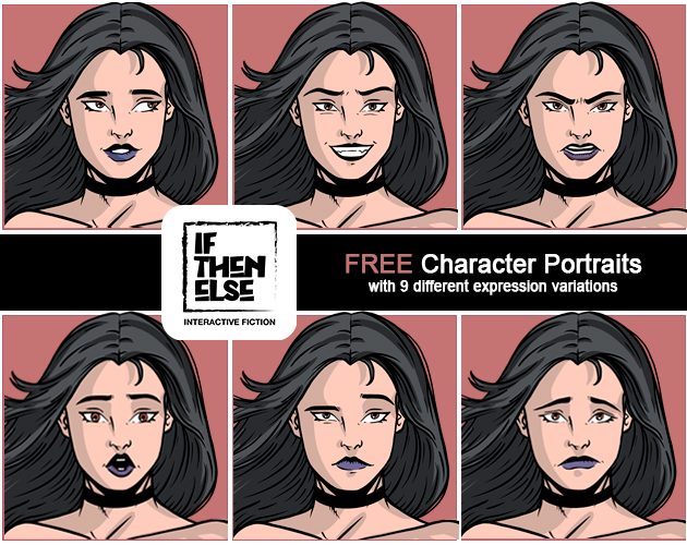 The free version of this asset includes 9 static PNG portraits that you can use in your free, non-commercial games as long as you credit IF THEN ELSE Interactive Fiction with a clickable link to this page. You may not modify these files.