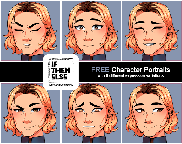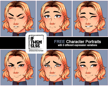 The free version of this asset includes 9 static PNG portraits that you can use in your free, non-commercial games as long as you credit IF THEN ELSE Interactive Fiction with a clickable link to this page. You may not modify these files.